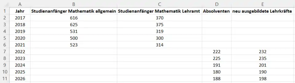 | Jahr | Studienanfänger Mathematik allgemein | Studienanfänger Mathematik Lehramt | Absolventen |
