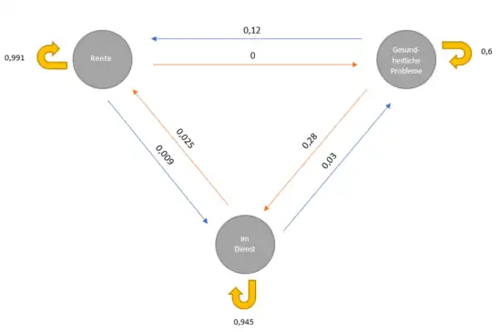 Im Fall von gibt die stochastische Matrix das Wechselverhalten an, beispielsweise bei den Kunden eines Cafés. Die Matrix wird so gelesen, dass in den Spalten die Cafés stehen, von denen die Kunden weggehen und in den Zeilen die Cafés stehen, in die die Kunden wechseln. Also von wo nach wo die Kunden wechseln. Konkret bleiben in diesem Beispiel also der Kunden dem Café A treu, während der Kunden von Café A zum Café C wechseln. Von Café B nach Café A wechseln beim nächsten Besuch der Kunden usw.