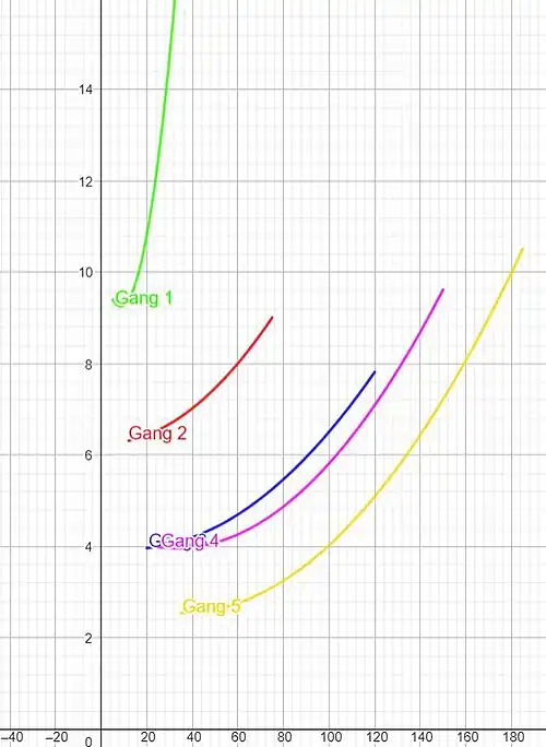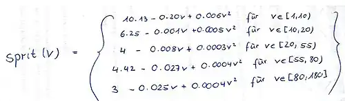 - Aufstellen sogenannter Verbrauchskurven pro Gang, sodass der Faktor Geschwindigkeit berücksichtigt wird (Funktionen in Abhängigkeit von der Geschwindigkeit v)