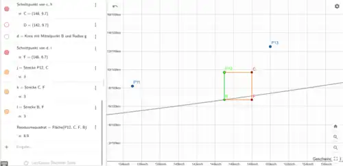 Es wurden zwei senkrechte Geraden zur -Achse erstellt. Jeweils durch einen Endpunkt der Strecke Dann wurde jeweils um einen Endpunkt der Strecke ein Kreis mit dem Radius der Streckenlänge gezeichnet. Man zeichnet den Schnittpunkt des Kreises mit der zugehörigen Senkrechten ein. Es gibt zwei Schnittpunkte, man entscheidet sich aber jeweils für einen. Danach verbindet man die zwei neuen Punkte mit den Endpunkten der Strecke, sodass ein Quadrat entsteht.