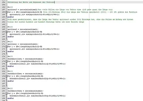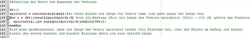 Das bedeutet also, das immer 100 Werte zusammengefasst werden für einen "Glättungspunkt". Somit kann erst ab dem 101Eintrag des Spritneuvektors geglättet werden, da davor noch keine 100 Einträge existieren. Das Gleiche gilt für die letzten 100 Einträge.