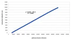 Dabei wird auf der x-Achse die zurückgelegte Strecke gegen die auf der y-Achse notierten verbrauchten Liter Kraftstoff aufgetragen. Dabei entsteht eine Punktwolke, die stark nach einem linearen Zusammenhang aussieht.
