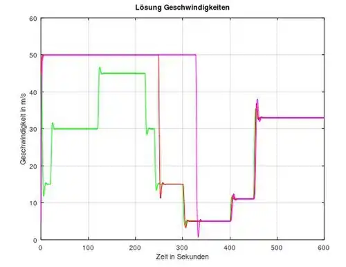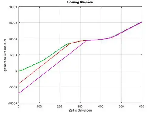 Der magentafarbene Graph steht für das dritte Auto. Der rote Graph für das zweite Auto. Der grüne Graph für das erste Auto. Der blaue Graph (nur in Lösung Strecken) steht für das nullte Auto.