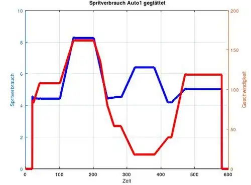 Um die Ergebnisse besser zu veranschaulichen, wurde das Werkzeug der Glättung bzw. des gleitenden Mittelwerts genutzt. Dies wurde angewandt auf die Spritfunktion der einzelnen Autos sowie bei der Geschwindigkeit.