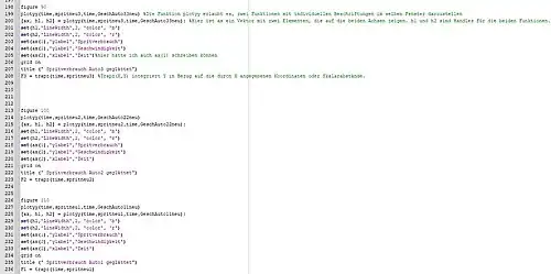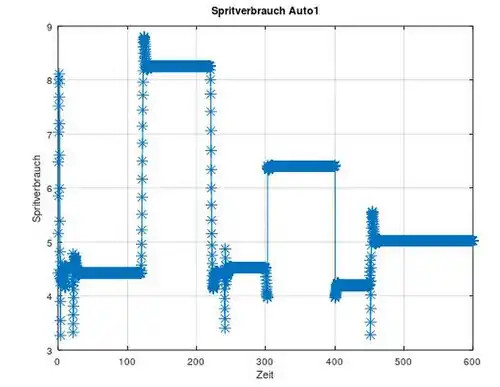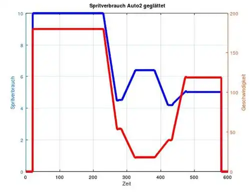 Jedoch wird in Octave eine Fehlermeldung angegeben, wenn nur diese Einträge berücksichtigt werden, denn dann stimmt die Länge des Spritneuvektors nicht mehr überein mit der Länge des time-Vektors, was beim Plotten zu Schwierigkeiten führt. Deswegen wird über zeros(size(time)) die Länge des Spritneuvektors vorgegeben und anschließend die Nullen durch die Glättungswerte ersetzt.