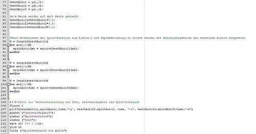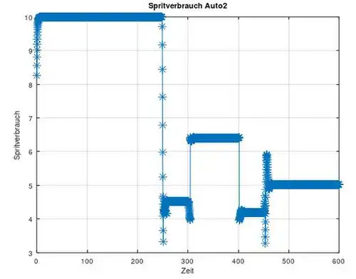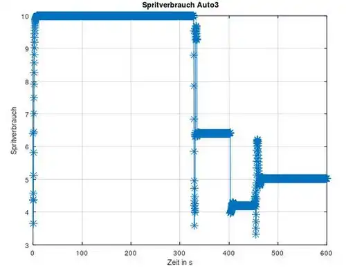 Die Geschwindigkeitsvektoren der einzelnen Autos werden nun in die -Funktion eingesetzt, umso den Spritverbrauch in Abhängigkeit zu der Zeit und zu der Geschwindigkeit zu haben.