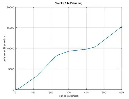 Zu Beginn fährt das 20 Sekunden mit einer Geschwindigkeit von 15m/s, was ungefähr 54km/h entspricht. Dies könnte als Beschleunigung auf den Beschleunigungsstreifen verstanden werden. Danach fährt es 100 Sekunden mit 30m/s (ca. 108km/h) weiter. Dann fährt es für weitere 100 Sekunden mit 45m/s (160km/h) bevor es dann 20 Sekunden wieder etwas zurück bremst auf 108km/h. Die weiteren 60s fährt es dann mit 54km/h, bevor es 100 Sekunden mit nur 18km/h fährt. Dies könnte als langsames Rollen in einem stockenden Verkehr gedeutet werden. Danach kann es wieder 50 Sekunden mit 40km/h fahren und die weiteren 150s wieder mit 120km/h.