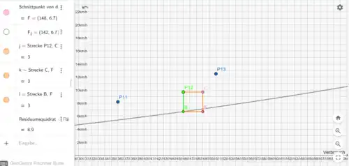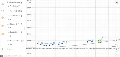 Danach wurde mit der Funktion Schnittpunkt, bei dem man zwei Objekte auswählt, die Schnittpunkte zwischen den senkrechten Geraden und der Kraftstoffverbrauchsfunktionen bestimmt. Mit dem Befehl Strecke, bei dem man zwei Punkte auswählt (bei uns der gerade bestimmte Schnittpunkt und der dazugehörige Messwert), konnte man dann die Strecken , , usw. bestimmen.