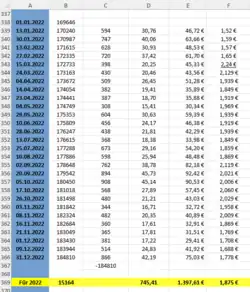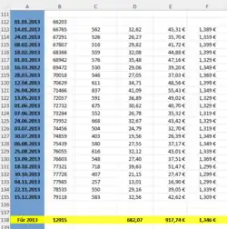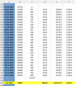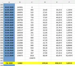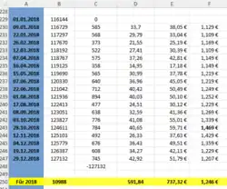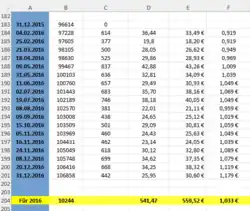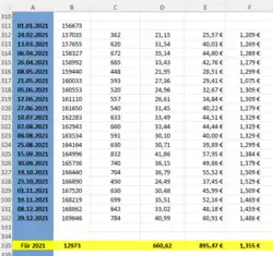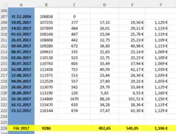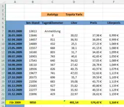 | Datum der Tankfüllung | Kilometerstand | Tageskilometer | getankte Liter | gezahlter Preis in Euro |