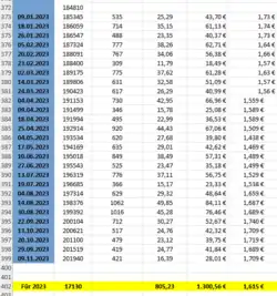 Dies führte zu dem Ergebnis, dass im Erhebungszeitraum vom 03.2009 bis zum 11.2023 eine Strecke von 188294 km zurückgelegt wurden und der Brennstoffverbrauch bei 9812,03 l Diesel beträgt.