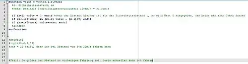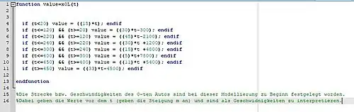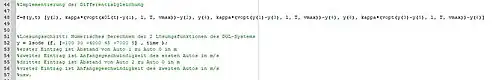 Zuerst wird das Problem durch eine Funktion beschrieben. Die Funktion muss zwei Argumente beinhalten. Zum einen der Vektor mit den momentanen Werten der betrachteten Größen und zum anderen ein Zeitintervall. In unserem Fall entspricht dies dem Abstand aller drei Autos zum und deren jeweiligen Geschwindigkeiten zum Start des Beobachtungszeitraums.
