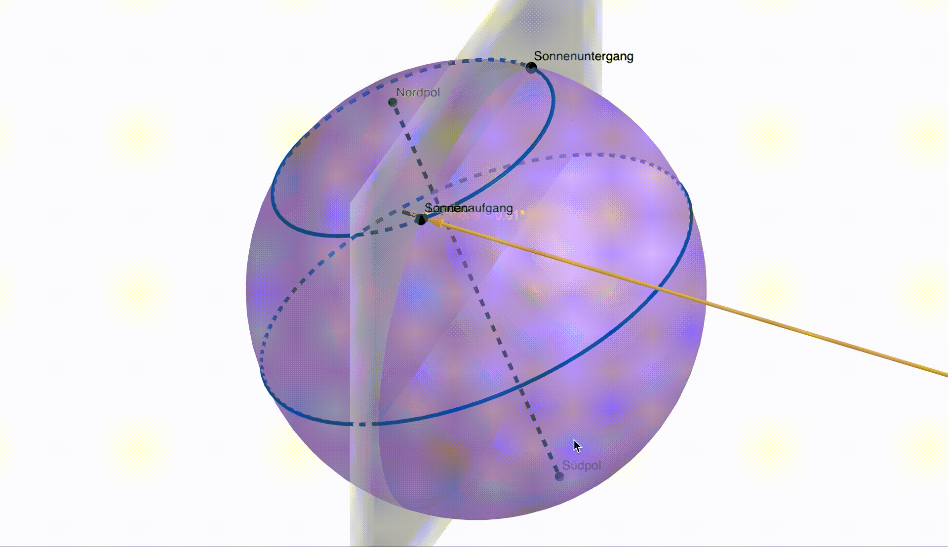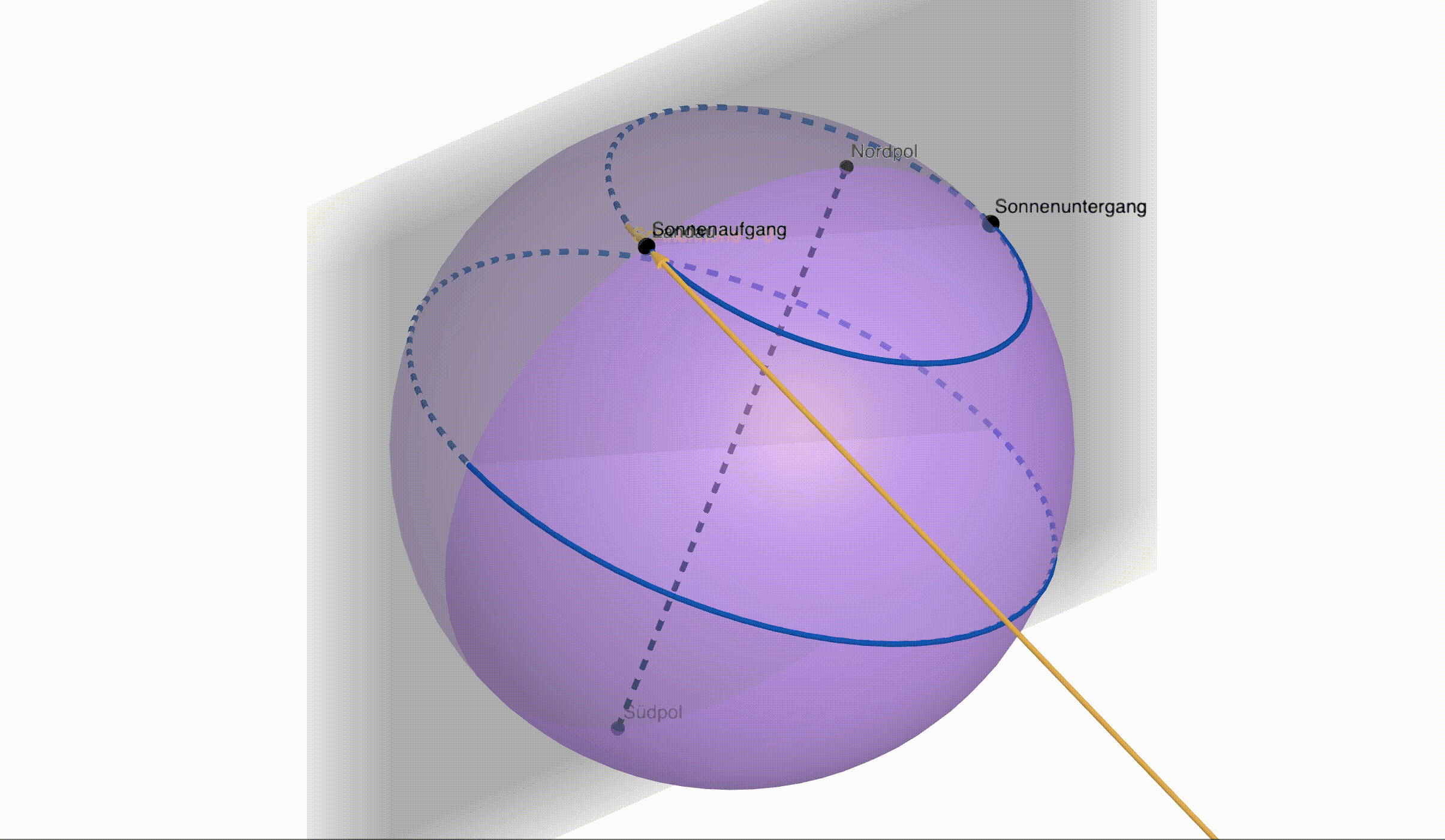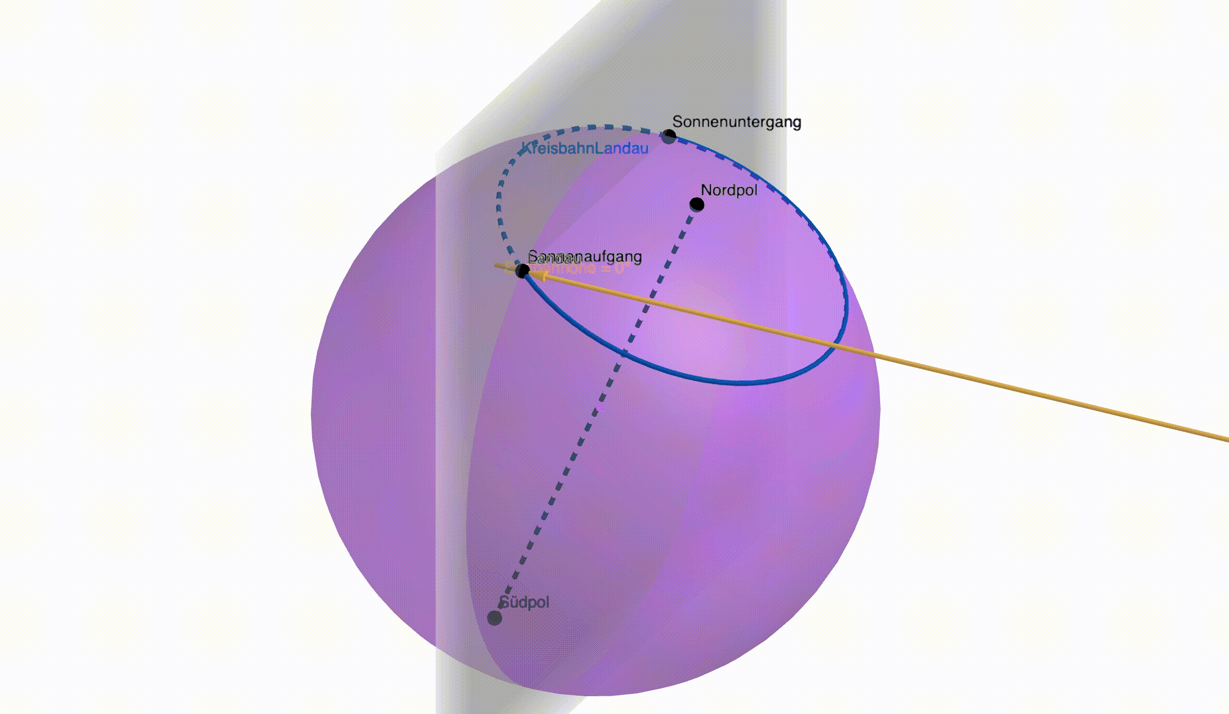 Wie man in den Dateien sehen kann, erreicht der Sonnenhöhenwinkel für ein festes sein Maximum stets um die Mittagszeit, zum Zeitpunkt . Dabei ist zu beachten, dass dieser Zeitpunkt nicht zwangsläufig mit 12:00 Uhr mittags übereinstimmt, sondern es handelt sich um den Zeitpunkt, an dem Landau auf seiner "Kreisbahn um die Erdachse" genau die Hälfte des Weges zwischen Sonnenaufgang und Sonnenuntergang zurückgelegt hat. Diesen Zeitpunkt bezeichnet man als 12:00 Uhr wahre Ortszeit.[2] Gleichzeitig handelt es sich dabei um genau den Zeitpunkt, zu dem Landau (an diesem Tag ) der Sonne am nächsten ist. Wenn man die dreidimensionale GeoGebra-Datei zu diesem Zeitpunkt richtig dreht (d.h. so, dass die -Achse zu einem Punkt wird), dann erhält man dieselbe Perspektive, die wir in unserer ersten GeoGebra-Datei eingenommen haben. Nun wird deutlich, dass dieses Maximum in für alle mit der zuvor berechneten Sonnenhöhe übereinstimmt. Darüber hinaus beträgt der Sonnenhöhenwinkel bei Sonnenauf- und Sonnenuntergang logischerweise 0°. Diese Idee verallgemeinern wir, um eine Formel zu finden, die den Sonnenhöhenwinkel in Abhängigkeit vom Zeitpunkt für einen beliebigen Jahrestag beschreibt. Dafür haben wir zwei Ideen: