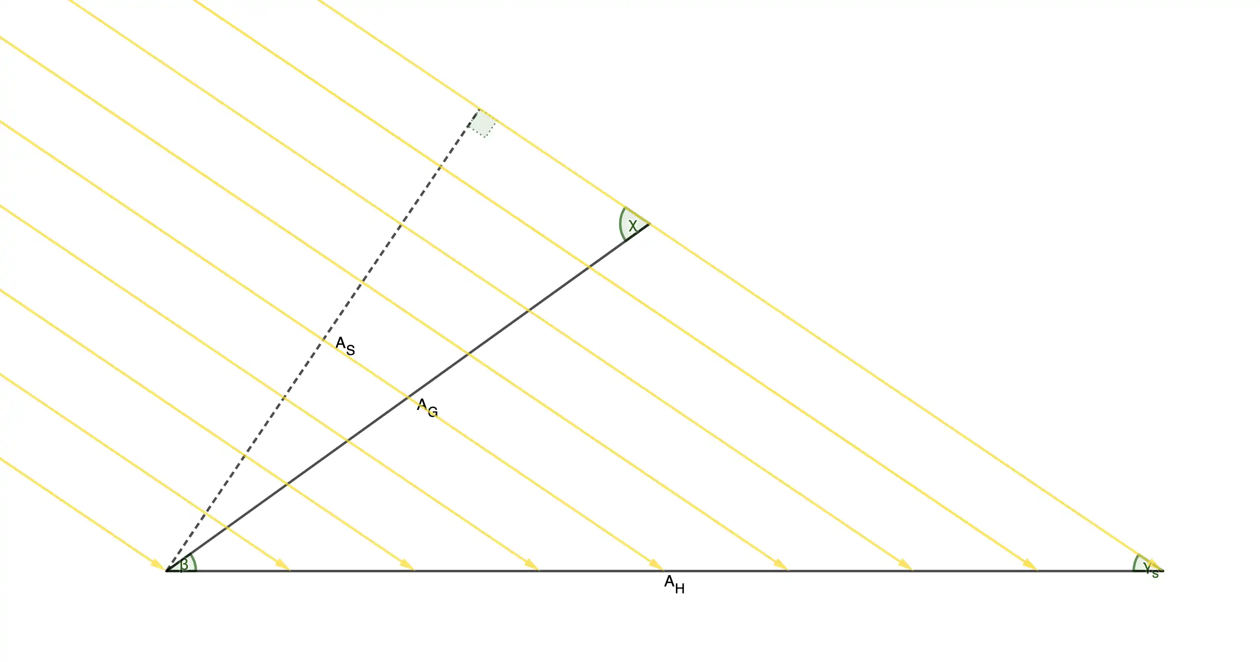 In der Skizze sieht man die horizontale Fläche , die senkrecht zu den Sonnenstrahlen stehende Fläche und die Fläche , die unserem späteren Solarmodul entspricht, das um den Winkel geneigt ist.