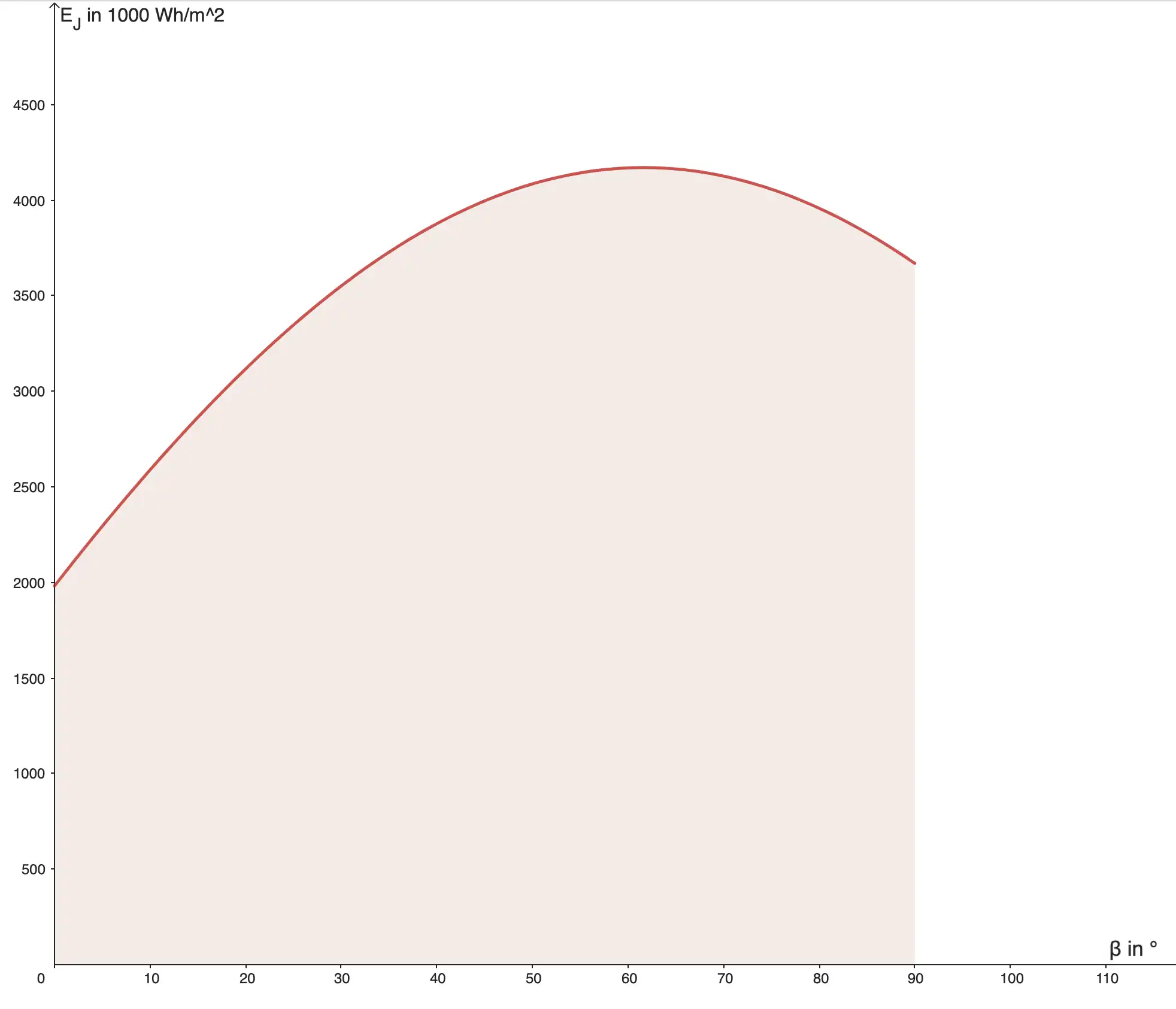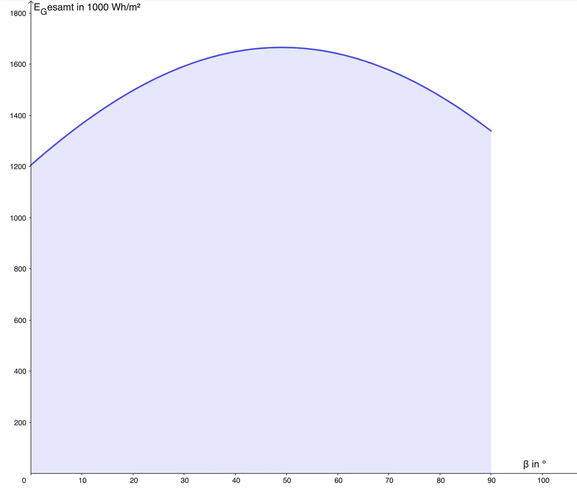 Mithilfe der Funktion können wir nun sogar die gesamte jährliche durch Direktstrahlung auftreffende Solarenergie (abhängig vom Neigungswinkel ) berechnen: