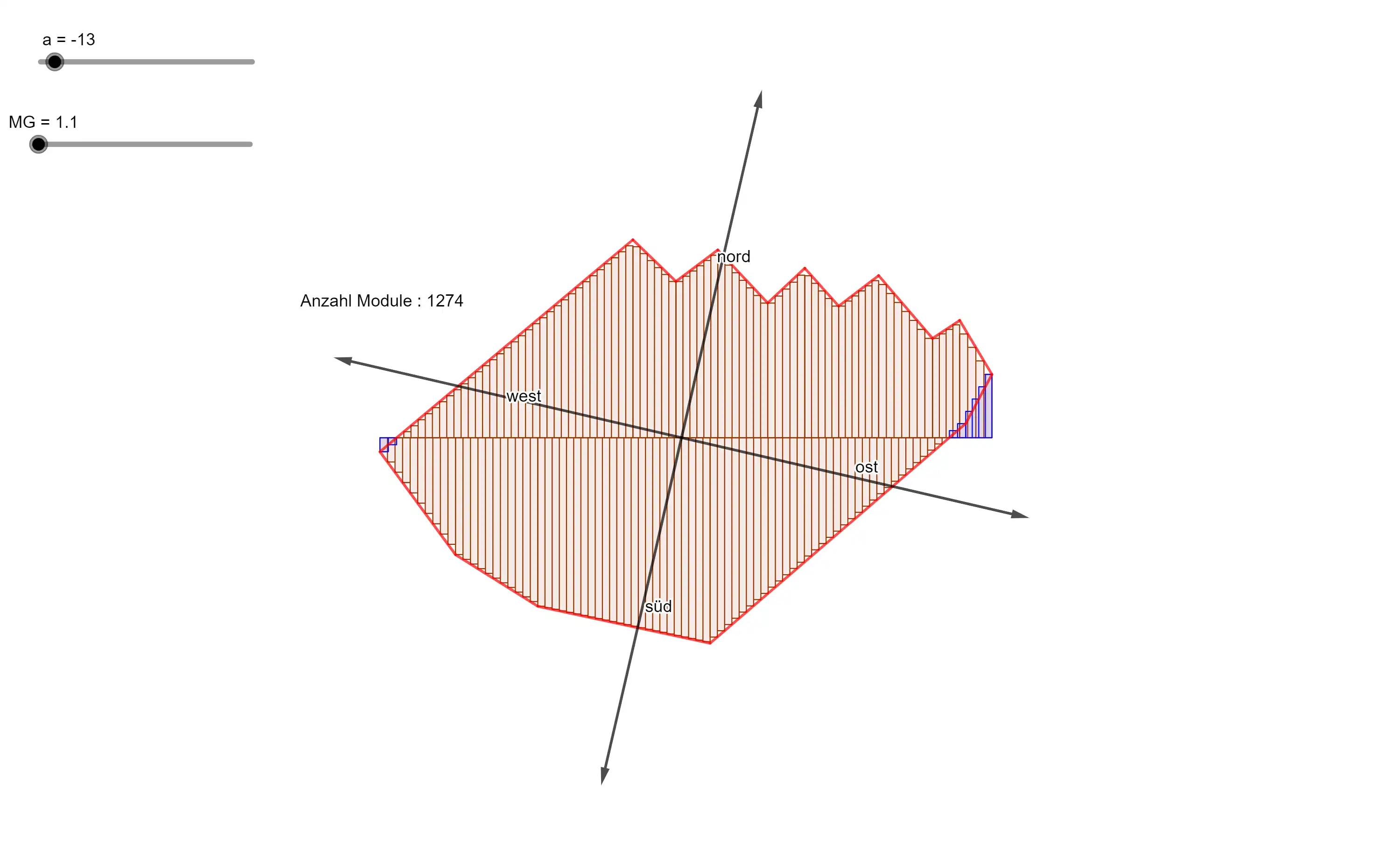Zur Bestimmung der Panelmenge der Fläche unterhalb der Trägergeraden passen wurde die Idee der Untersumme angewendet, die an die Struktur des Parkplatzes angepasst ist. Mithilfe des Befehls List wurden Balken erzeugt, die einer Untersumme ähneln und approximativ die Form der Parkplatzstruktur nachbilden.