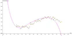 Bei ergibt sich eine angenäherte Funktion , bei der alle Punkte auf dem Graphen liegen. ist jedoch nur im Intervall zu betrachten, da Minderjährige nicht wahlberechtigt sind und Realwerte zum Vergleich nur bis zur Altersgruppe 75 Jahre vorliegen (je größer der x-Wert, desto weniger entspricht der Graph der Approximation einem realen Ergebnis, da z.B. die Altersgruppe 140 Jahre nicht existiert).