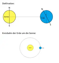 Die Deklination in der Astronomie (lateinisch für „Abweichung, Beugung“) bezeichnet die radiale Abweichung der Drehachse der Erde von der Drehachse der Sonne, wenn man diese durch einen seitlichen Schnitt betrachtet. Durch den Umlauf der Erde um die Sonne ändert sich im Laufe des Jahres diese Deklination. Ausgangspunkt ist zunächst der 21. März, da hier die Sonne beim Äquator im Zenit steht und somit die Deklination beträgt. Dabei schwankt sie im Laufe eines Jahres zwischen , wenn die Nordhalbkugel der Sonne zugewandt ist und , wenn die Südhalbkugel der Sonne zugewandt ist. Diese Schwankung ist periodisch und lässt sich als Sinus-Funktion darstellen, da sie sich jährlich wiederholt. Für die Periodendauer ergibt sich demnach Tage. Zunächst wird eine einfache periodische Funktion mit der Periodendauer hergeleitet: