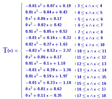 Im nächsten Schritt wurden diese Werte nach Temperaturdifferenzen sortiert, wie in Tabelle 2 zu sehen ist. Unten befinden sich die Mittelwerte der zu den verschiedenen Temperaturdifferenzen gehörigen Transmissionskoeffizienten. So kann jeder Temperaturdifferenz ein Transmissionskoeffizient zugeordnet werden. Veranschaulicht ist dieses Ergebnis in Abbildung (*). Um nun eine Funktion zu ermitteln wird eine Spline Interpolation durchgeführt. Mit Berechnung in Maxima kommt man auf folgende Funktion: