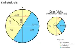 Ist die Deklination und der Breitengrad bekannt, lässt sich der zusätzlich beleuchtete Abschnitt des Breitengrades berechnen. Durch Verwendung des Tangens erhalten wir: . Es gilt somit: