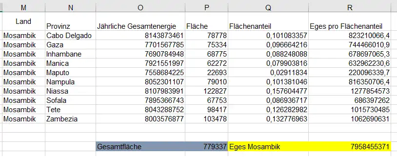 Ersetzt man die atmosphärische Durchlässigkeit mit dem monatlichen Transmissionskoeffizienten und summiert die Tage dieses Monats auf, so erhält man die eingestrahlte monatliche Energie pro Quadratmeter. Dies wurde für jede Provinz einzeln gemacht (unterschidlicher Breitengrad ). Anschließend summiert man die Monatlichen Werte pro Quadratmeter zu der jährlich eingestrahlten Energie pro Quadratmeter auf. Um einen Mittelwert für ganz Mosambik zu erhalten, wird der wirkende Anteil jeder Provinz als Anteil ihrer Fläche zu ganz Mosambik bestimmt. Exemplarisch erhält man für jede Provinz folgende Gleichung: