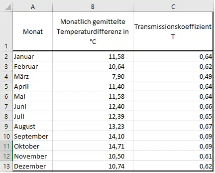 Mit der obigen Formel lassen sich nun die Transmissionskoeffizienten ausrechnen. Da die Funktion nur zu Temperaturdifferenzen aus Johannesburg (Südafrika) passt, verwenden wir auch die Temperaturdifferenzen dieser Stadt um monatliche Transmissionskoeffizienten zu erhalten. Die nachfolgende Grafik zeigt unsere Ergebnisse: