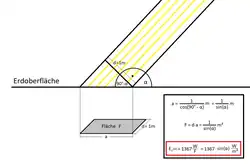 Um die Gesamtenergie, die durch die Sonne pro Jahr pro Quadratmeter auf Mosambik trifft zu berechnen, ist es zunächst wichtig zu bestimmen wie viel Energie pro Tag pro Quadratmeter auf die Erde trifft. Dabei muss der Winkel, den die Sonnenstrahlen gegenüber der Erdoberfläche hat, berücksichtigt werden (z.B. trifft am Morgen und am Abend weniger Energie auf die Erdoberfläche als Mittags, wenn die Sonne im Zenit steht). Dieser Winkel geht über den Sinus in die Funktion ein, da je nach Sonneneinstrahlwinkel nur ein gewisser Anteil der Sonnenenergie auf die Erdoberfläche trifft. Die Herleitung wird in der nebenstehenden Grafik verdeutlicht. Mithilfe der Solarkonstanten lässt sich diese tägliche Gesamtenergie berechnen. Dabei ist der Tagesanfang (Beginn der Sonneneinstrahlung) und die vergangene Zeit bis zum Sonnenuntergang in Sekunden. ist die Fläche, auf die die Sonnenstrahlung wirkt.