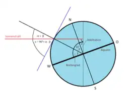 Für den Einfallswinkel der Sonnenstrahlen in Abhängigkeit der Deklination und der geographische Breite erhalten wir (siehe Herleitung in der nebenstehenden Grafik):