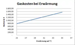 In untenstehenden Diagramm sind nun die verschiedenen Energiemengen aufgetragen, die benötigt werden um das Wasser auf die gewünschte Temperatur zu bringen. Ferner wurden aufgrund der aktuellen Energiepreise die Kosten für eine Erwärmung mit Gas und für die Erwärmung mit Strom aufgetragen. Hier ist zu erkennen, dass das Beheizen mit Gas deutlich günstiger ist.