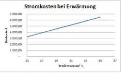 Weiter ist anzumerken, dass bei Formel (1) eine Energiemenge in kJ herauskommt. Diese wurde in der Grafik bereits in MJ umgerechnet. Ein MJ entsprechen 3,6 kwh. Diese Umrechnung ist insofern wichtig, als dass Energiepreise meist in kwh angegeben werden. Zur Erklärung: Wird ein Gerät mit einer Leistung von 1 kw eine Stunde betrieben, beschreibt dies die verbrauchte Energie, also eine Kilowattstunde (oder Arbeit).