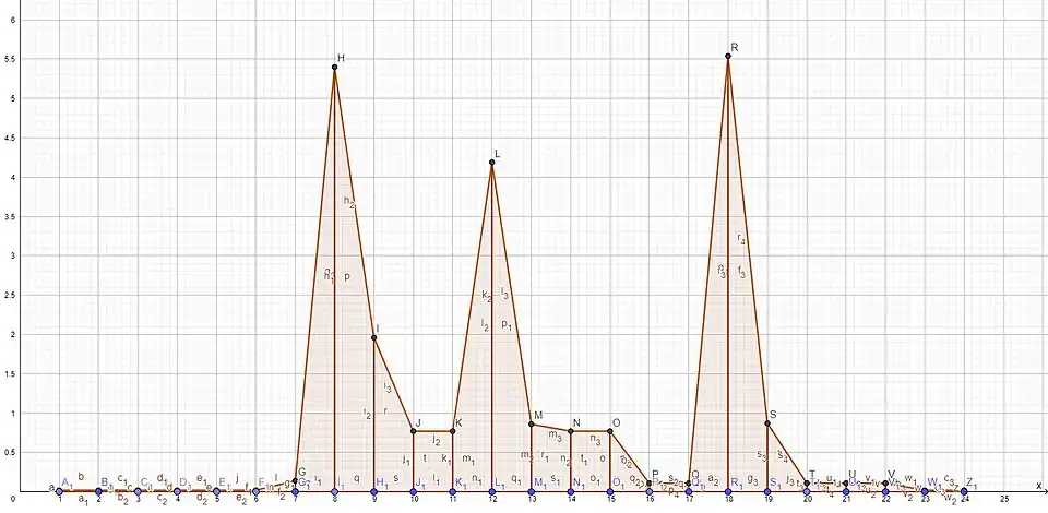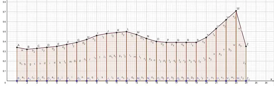 Wie man in den obigen Abbildungen erkennen kann, wurde der Graph in 23 Trapeze unterteilt. Hieraus ergaben sich unter Verwendung von GeoGebra folgende Flächeninhalte: