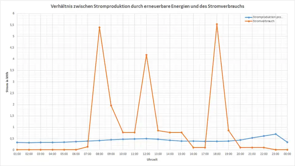- Wie sich erkennen lässt, existiert zu den Piks bzgl. der Stromnutzung ein relatives großes Defizit an Stromversorgung durch erneuerbare Energien. Insgesamt lässt sich diese Tendenz über den ganzen Tag, bis auf die Zeitintervalle von 1 Uhr bis 7 Uhr und 20 Uhr bis 24 Uhr, erkennen. Morgens bis 7 Uhr, zwischen 15:30 Uhr und 17 Uhr und abends ab 19:30 Uhr kann eine Stromversorgung allein durch erneuerbare Energien gewährleistet werden. Zwischen 7 Uhr und 15:30 und 17 Uhr und 19:30 Uhr wird zur aktuellen Produktion zusätzlich Strom aus externen Quellen benötigt, da der Bedarf an Strom sonst nicht gedeckt werden kann.