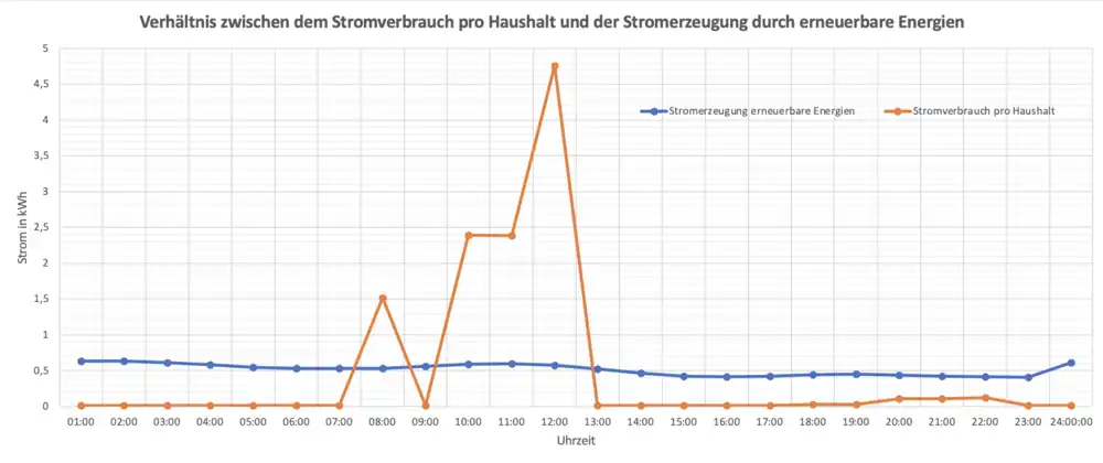 - Das gemeinsame Diagramm zeigt, dass Morgens von 7 bis 9 Uhr und Vormittags von 10 bis 13 Uhr der Stromverbrauch deutlich über der Stromerzeugung durch erneuerbaren Energien liegt. Die restlichen Zeit liegt der Stromverbrauch unter der Kurve des Stromerzeugung.