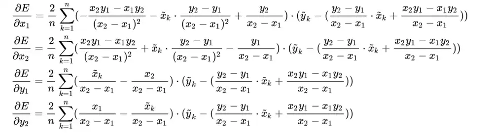 Zur Minimierung des Fehlers verwendet wir das Gradientenabstiegsverfahren, welches in Octave umgesetzt wird. Da unsere Fehlerfunktion von , , , abhängt müssen wir diese vier mal partiell ableiten um unseren Gradienten zu erhalten. Die partiellen Ableitung wurden mithilfe von WxMaxima berechnet.