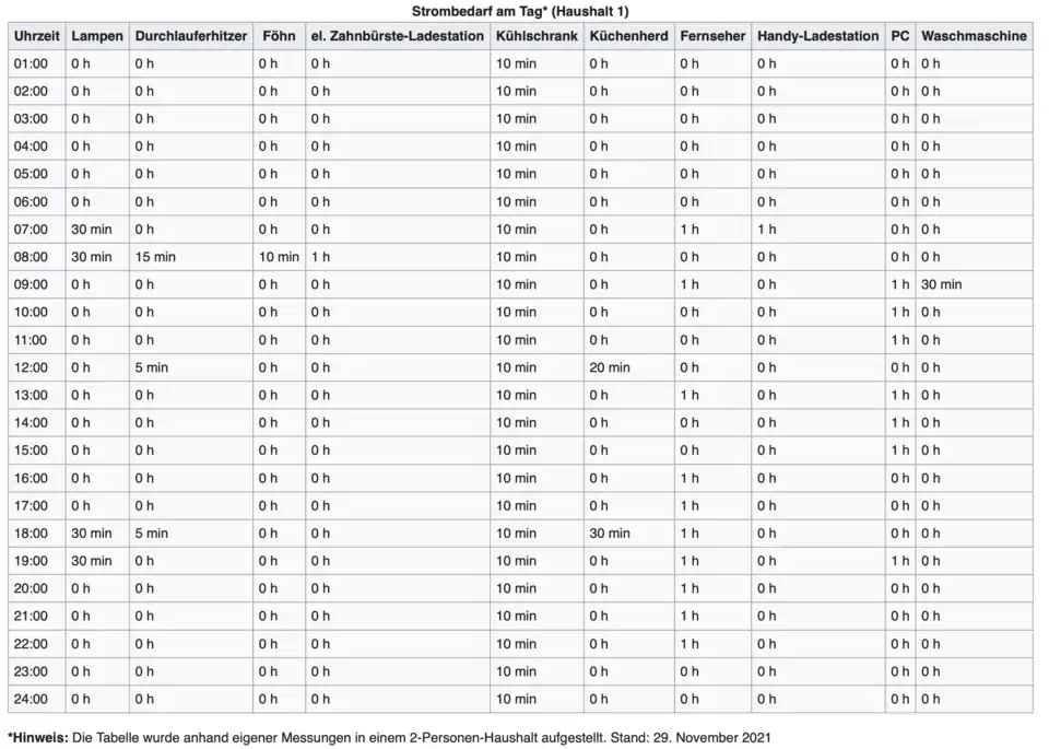 - Tabelle mit der Nutzungsdauer zur jeweiligen Uhrzeit