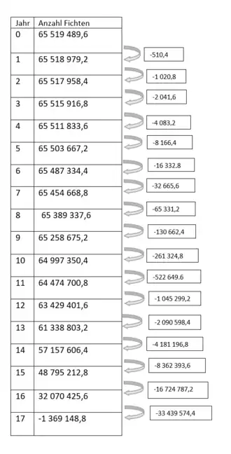 Bei dieser Formel bezeichnet F die Anzahl an Fichten zu Beginn des ersten Berechnungsjahres (siehe Datenerhebung, F=65 520 000), F(t) die Anzahl der Fichten in Jahr t und B(t) ist die Anzahl der Borkenkäfer in Jahr t. Mithilfe dieser Rechnung ergibt sich dann eine Tabelle, in der ersichtlich wird, wie die Anzahl der Borkenkäfer die Fichtenpopulation beeinflusst. Mit Hilfe dieser Tabelle können dann verschiedene Überlegungen zu den Funktionen, die hinter dieser Berechnung stehen, gemacht werden.