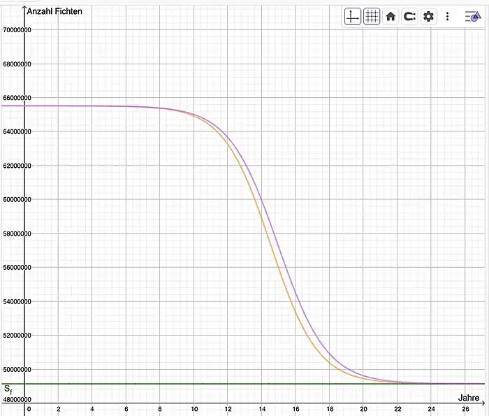 Für diese Modellierung ist es allerdings sinnvoller, eine Funktion für die überlebenden Fichten aufzustellen, da untersucht werden soll, wie sich die Fichtenpopulation verhält. Dafür muss man die Anzahl geschädigter Fichten von der Anzahl der Fichten, die zu Beginn existieren, abziehen. Diese Funktion sieht dann folgendermaßen aus: