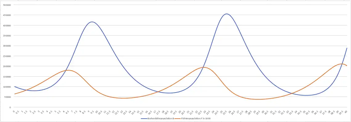 Im Folgenden wurden einige Modellannahmen an die Situation getroffen. Die Gruppe ist davon ausgegangen, dass sich die Borkenkäferanzahl jährlich verdoppelt und immer 200 Borkenkäfer einen Baum töten. Ein Käfer befällt in unserer Annahme allerdings nicht mehr als einen Baum wärend seines Lebens, da seine Lebensspanne maximal 1-2 Jahre beträgt. Auf Basis dieser Annahme wurden die folgenden Berechnungen durchgeführt. Es wurde die Anzahl überlebender Fichten nach den einzelnen Jahren ermittelt. Ebenfalls wurde die Anzahl der Borkenkäfer berechnet.