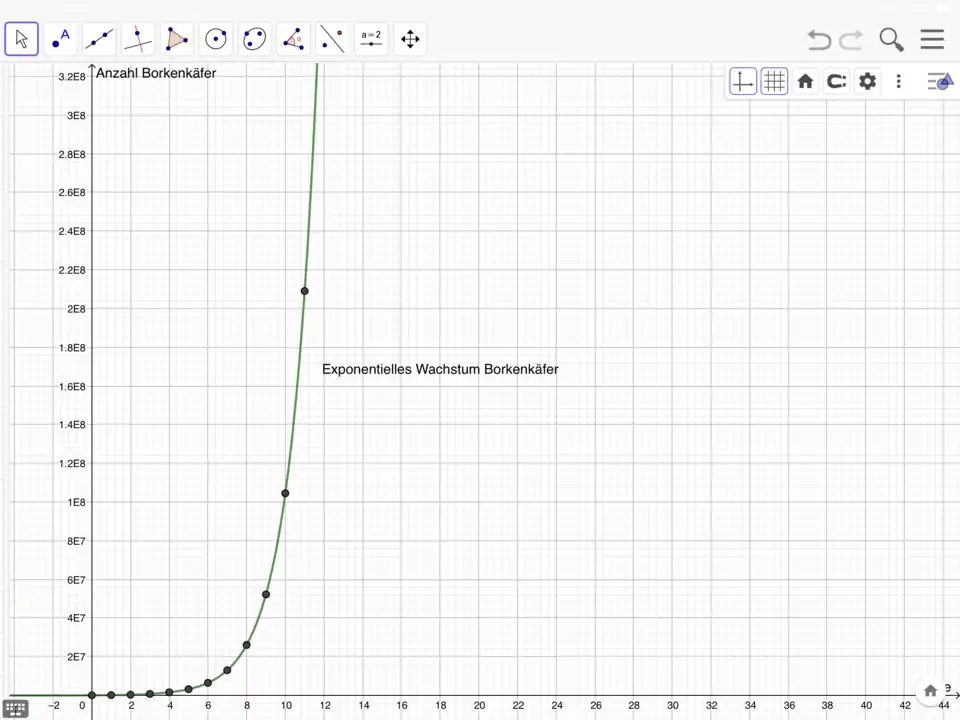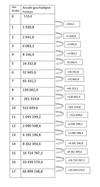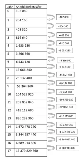 102080 ist die Anzahl an Borkenkäfern im Jahr 0 und für die folgenden Jahre gilt, dass immer einer Verdopplung der Anzahl des Vorjahres stattfindet.