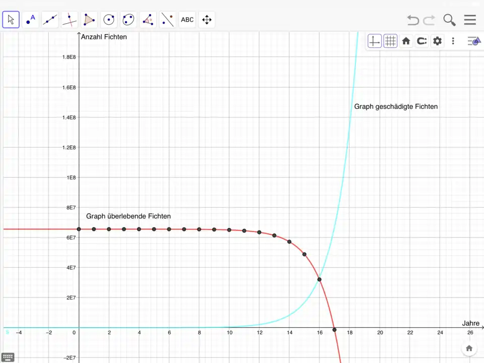 Den Zusammenhang der beiden Funktionen kann man sowohl graphisch als auch anhand der Funktionsvorschriften untersuchen. Schaut man sich die beiden Funktionen graphisch an, so stellt man fest, dass die Funktion der überlebenden Fichten gerade die Funktion für die Anzahl geschädigter Fichten ist, allerdings an der x-Achse gespiegelt und nach oben verschoben. Betrachtet man nun die beiden Funktionsvorschriften, so wird dies ebenfalls deutlich.