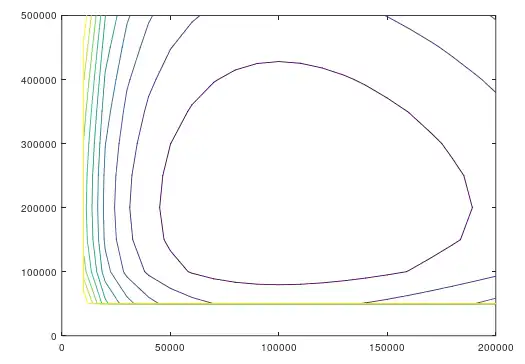 Nun interessiert man sich für die Höhenlinien dieser Funktion im 1. Quadranten, da negative Anzahlen für Fichten- bzw. Borkenkäferpopulation in der Realität ausgeschlossen sind. Im folgenden wird nun gezeigt, dass es ein Minimum der Funktion gibt und die restlichen Höhenlinien geschlossene Kurven sind.