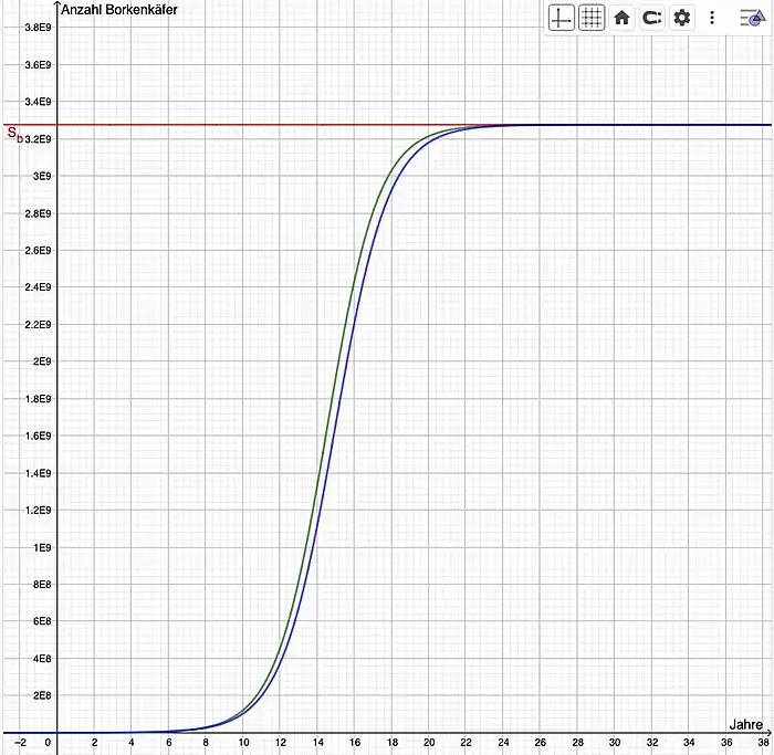 Bei den Borkenkäfern wurde die Annahme getroffen, dass sie sich jedes Jahr verdoppeln, wobei der Ausgangswert der Borkenkäfer 102080 Individuen entspricht. Das bedeutet, dass man die Anzahl der Borkenkäfer mit Hilfe einer Exponentialfunktion modellieren kann, welche wie folgt aussieht: