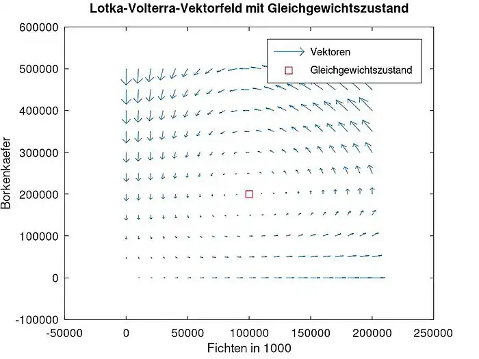 Das Wachstum F'(t) ist also zum Bestand F(t) und zur Differenz proportional, wobei hier B(t) der Bestand der Borkenkäfer zum Zeitpunkt t ist. ist also hier als kritischer Wert zu erkennen. Denn falls ist das Wachstum der Fichtenpopulation positiv und die Fichtenpopulation nimmt zu. Falls , so ist das Wachstum negativ und die Fichtenpopulation nimmt ab.