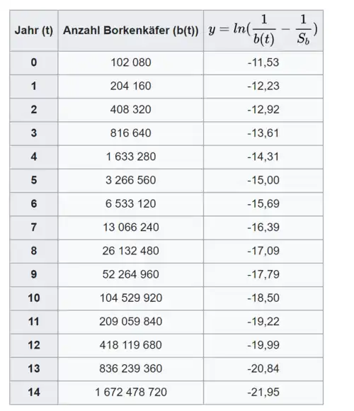 Die Anzahl der Borkenkäfer zum Zeitpunkt t in Abhängigkeit dieser zur Sättigungsgrenze
