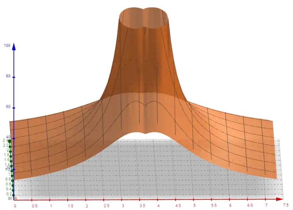 WXMaxima wurde im dritten Modellierungszyklus genutzt, um die erarbeitete Funktion f im Raum darzustellen. Hierbei der Umstieg von GeoGebra auf WXMaxima, da es in WXMaxima leichter fällt, Funktionen mit mehreren Parametern zu definieren, wobei die Parameter durch erneutes Ausführen der Befehle zur Definition der Parameter direkt in die Funktionsgleichung übernommen werden können, wenn auch diese zur Aktualisierung erneut ausgeführt wird. Außerdem kann nach dem Plot des Funktionsgraphen eine Art Heatmap erzeugt werden, indem man den Graphen in der Ansicht auf Frontalansicht auf die horizontal liegende Ebene einstellt. Dadurch wird das Tor frontal besichtigt, wobei die verschiedenen Farben des Graphen dann die Heatmap erzeugen. Zur Erstellung des Graphen wurden folgende Funktionen von WXMaxima genutzt: