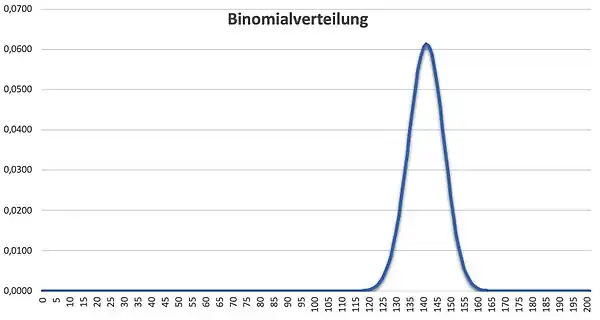 Für die Darstellung der Binomailverteilung greifen wir auf unsere gesamten Daten zurück und betrachten die Wahrscheinlichkeit für einen Treffer unabhängig von der Torfläche. Somit haben wir eine Versuchszahl von 201 Schüssen und eine Wahrscheinlichkeit von 0,701. Mit diesen Werten ergibt sich folgende Binomialverteilung: