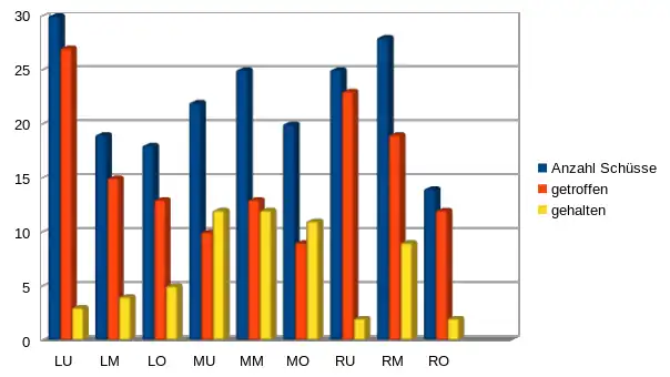Nun möchten wir aber das Tor nicht nur in drei Teile (Links, Mitte, Rechts) unterteilen, sondern in neun, um möglichst genaue und auch variantenreiche Trefferquoten ermitteln zu können. Das Tor ist somit in unterteilt in links unten(LU), linksmitte(LM), linksoben(LO), mitte unten(MU), mitte mitte (MM), mitte oben (MO), rechts unten (RU), rechts mitte (RM), rechts oben (RO). Ein Elfmeter gilt also als verwandelt, wenn der Torwart nicht nur die selbe Ecke auswählt, sondern auch das selbe Teilfeld. Somit verändern sich auch die Trefferwahrscheinlichkeiten, da der Torwart jetzt nicht mehr 1/3 abdeckt, sondern nur noch 1/9 der Torfläche. Die Trefferwahrscheinlichkeit erhöht sich für die Schützen auf 8/9, sprich etwa 88,89%.