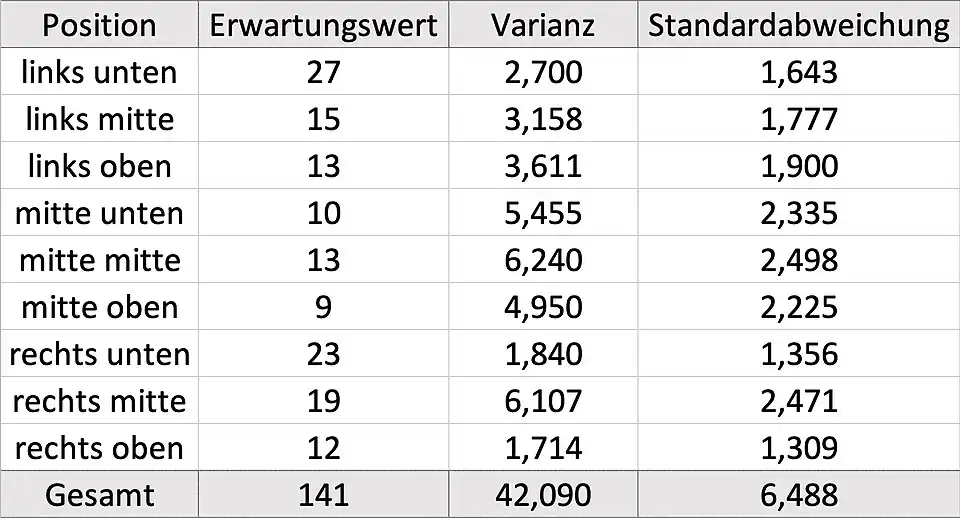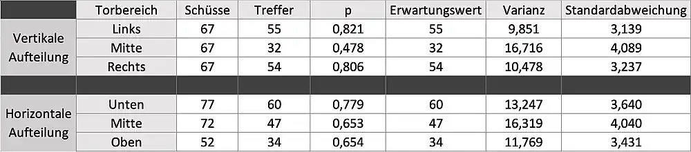 Anschließend teilen wir das Tor vertikal in die Bereiche Links, Mitte und Rechts und horizontal in die Bereiche Unten, Mitte und Oben auf. Hier berechnen wir nochmal Erwartungswert, Varianz und Standardabweichung. So können noch mehr Vergleiche angestellt und Aussagen über anzustrebende Bereiche beim Elfmeter getroffen werden.