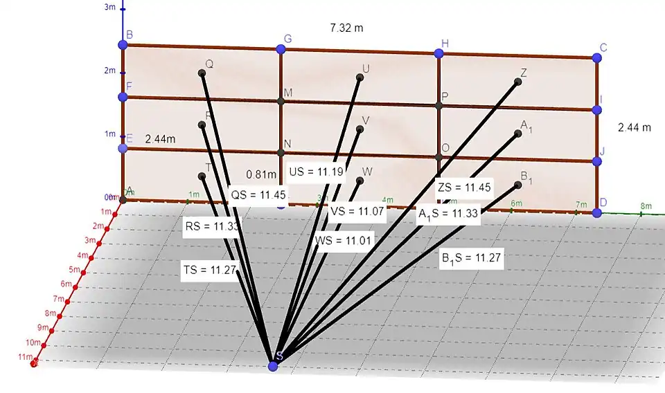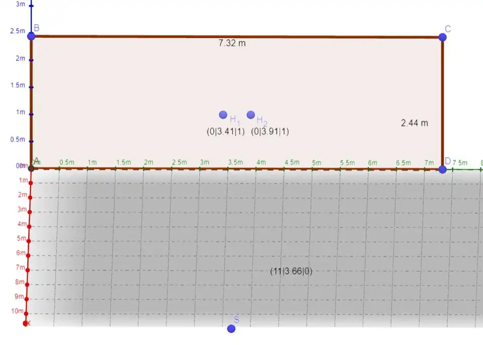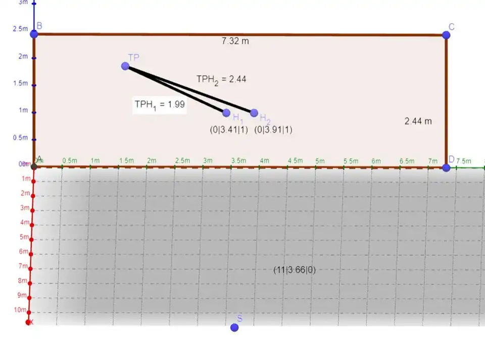 Betrachtet man ein Fußballtor im , wobei das linke untere Eck des Tors im Koordinatenursprung liegt, kann man mittels dreidimensionalen Koordinaten die neun Treffpunkte und die Position des Elfmeterpunkts S ausmachen: