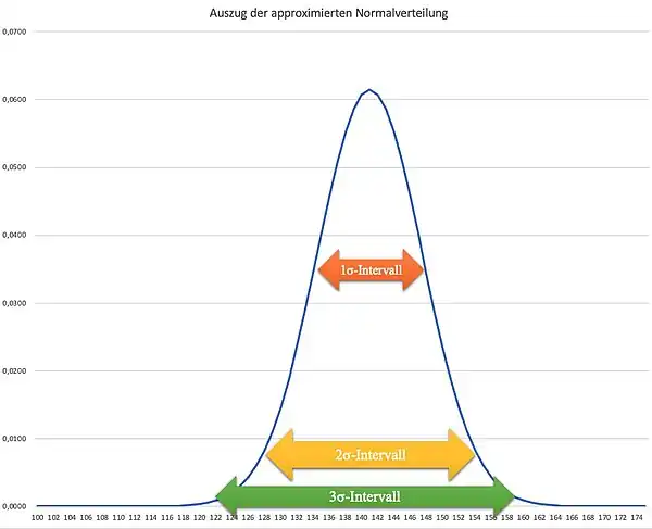 - 3σ-Intervall = 140,901 ± 3 • 6,488 = [121,44 ; 160,37]