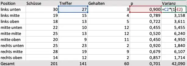 - Berechnung von Erwartungswert, Varianz und Standardabweichung für verschiedene Bereiche des Tors